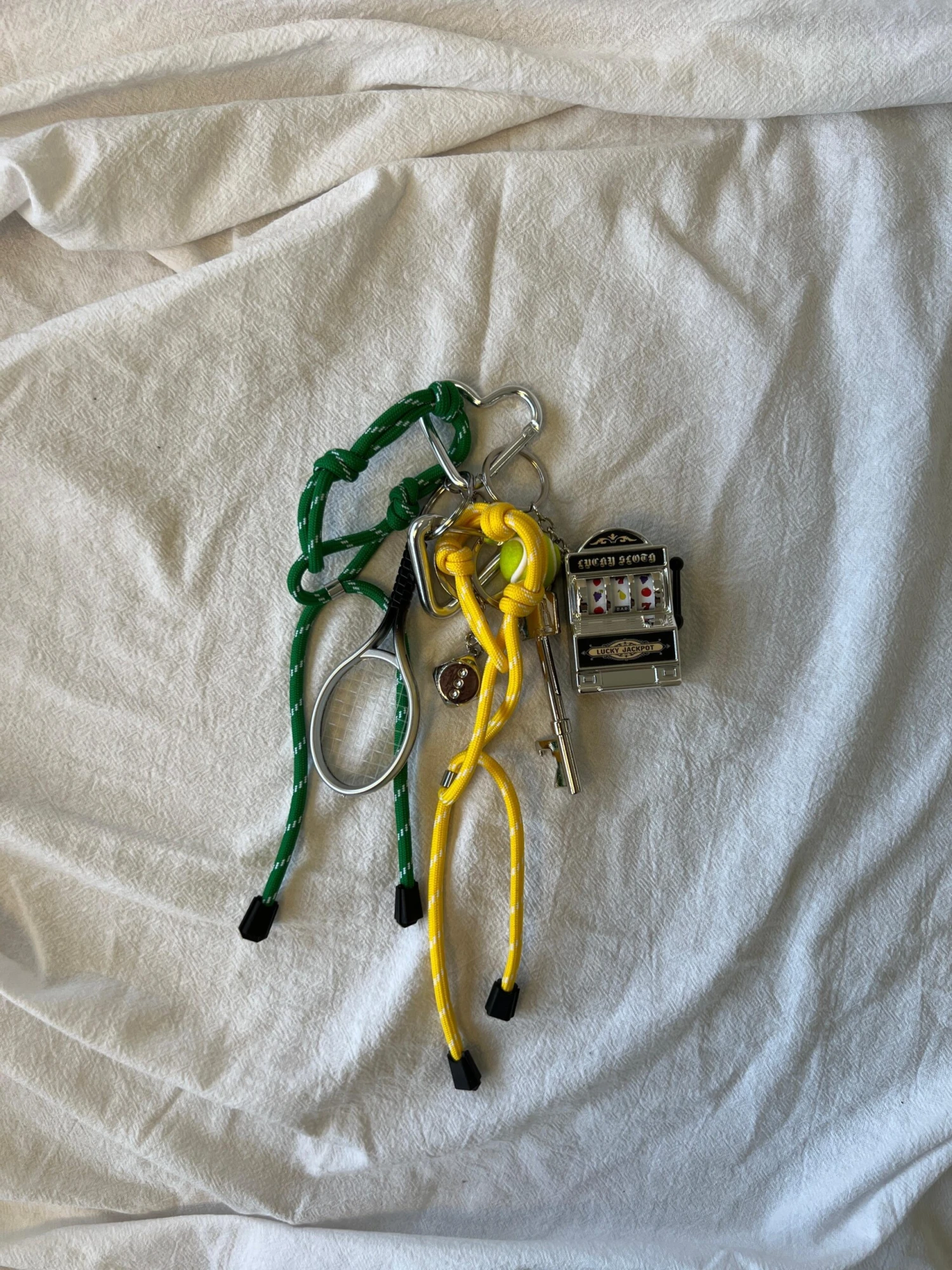 Accompanying the slot machine are vibrant, casino-inspired elements that further enhance the charm’s overall aesthetic. A pair of bright green, knotted cords symbolize the felt of a casino table, while yellow cords with black accents mimic the look of a measuring tape used in games like craps.