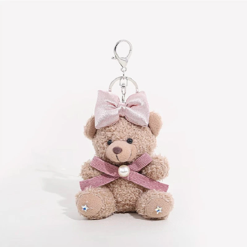 - Plush teddy bear bag charm in a soft, warm taupe color