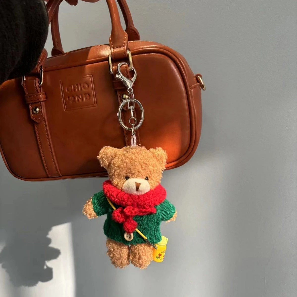 Bring a touch of holiday cheer to your accessories with the Green Sweater Teddy Bear Charm. This adorable charm features a fluffy teddy bear dressed in a festive green and red sweater, complete with a cozy scarf, perfect for adding a playful and seasonal element to your favorite bags, backpacks, or keys.