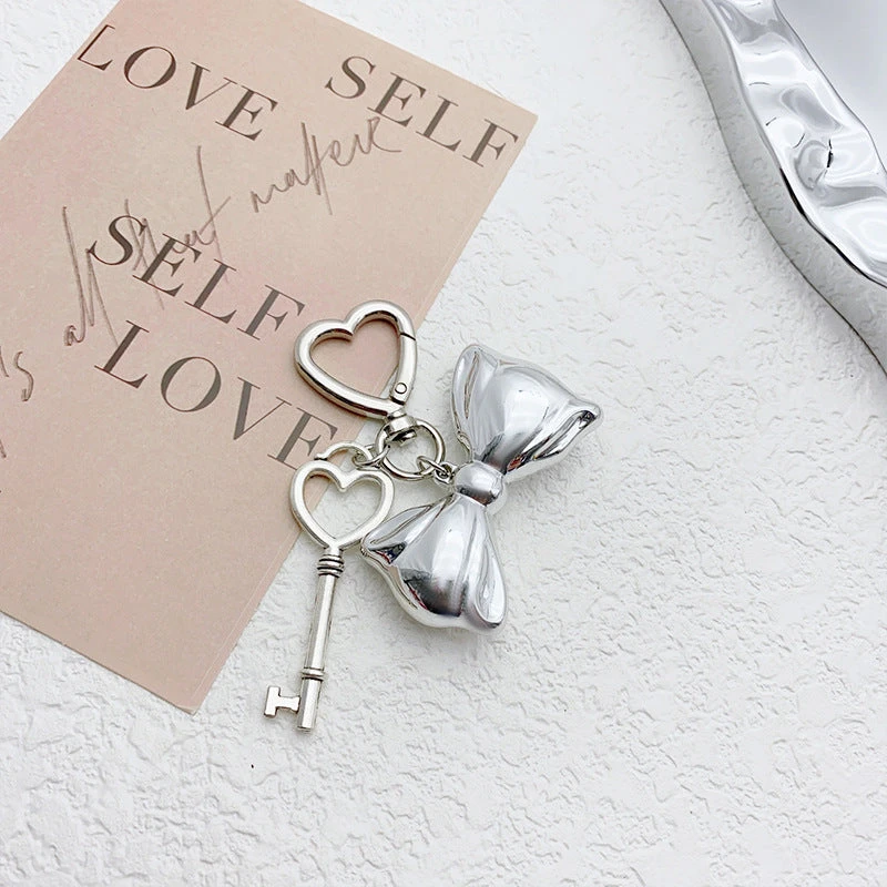 - Silver bow-shaped keyring with a heart-shaped cutout