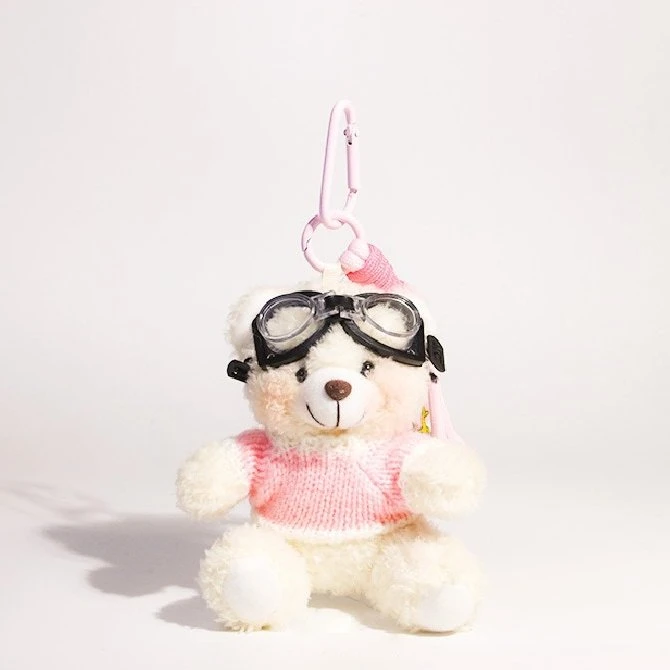 Bring a pop of pink and a dash of adventure to your accessories with this charming aviator bear!