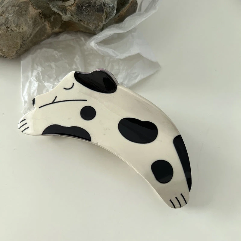 Add a touch of playful canine charm to your hairstyles with the Spotted Pup Hair Claw. This delightful accessory features an adorable spotted dog design with a black and white color scheme, bringing a whimsical and eye-catching element to your look.